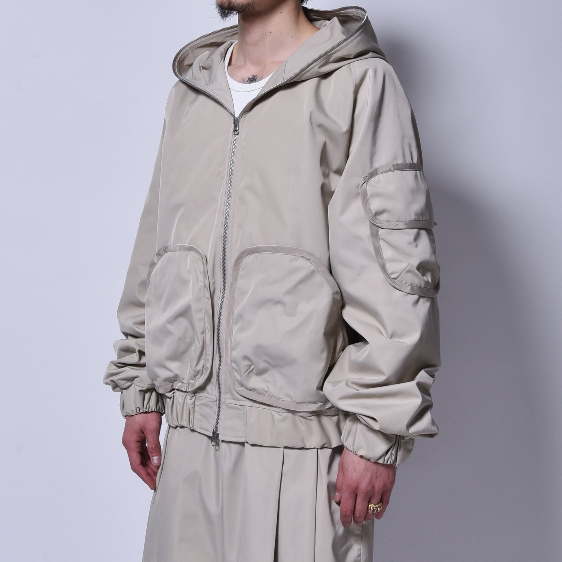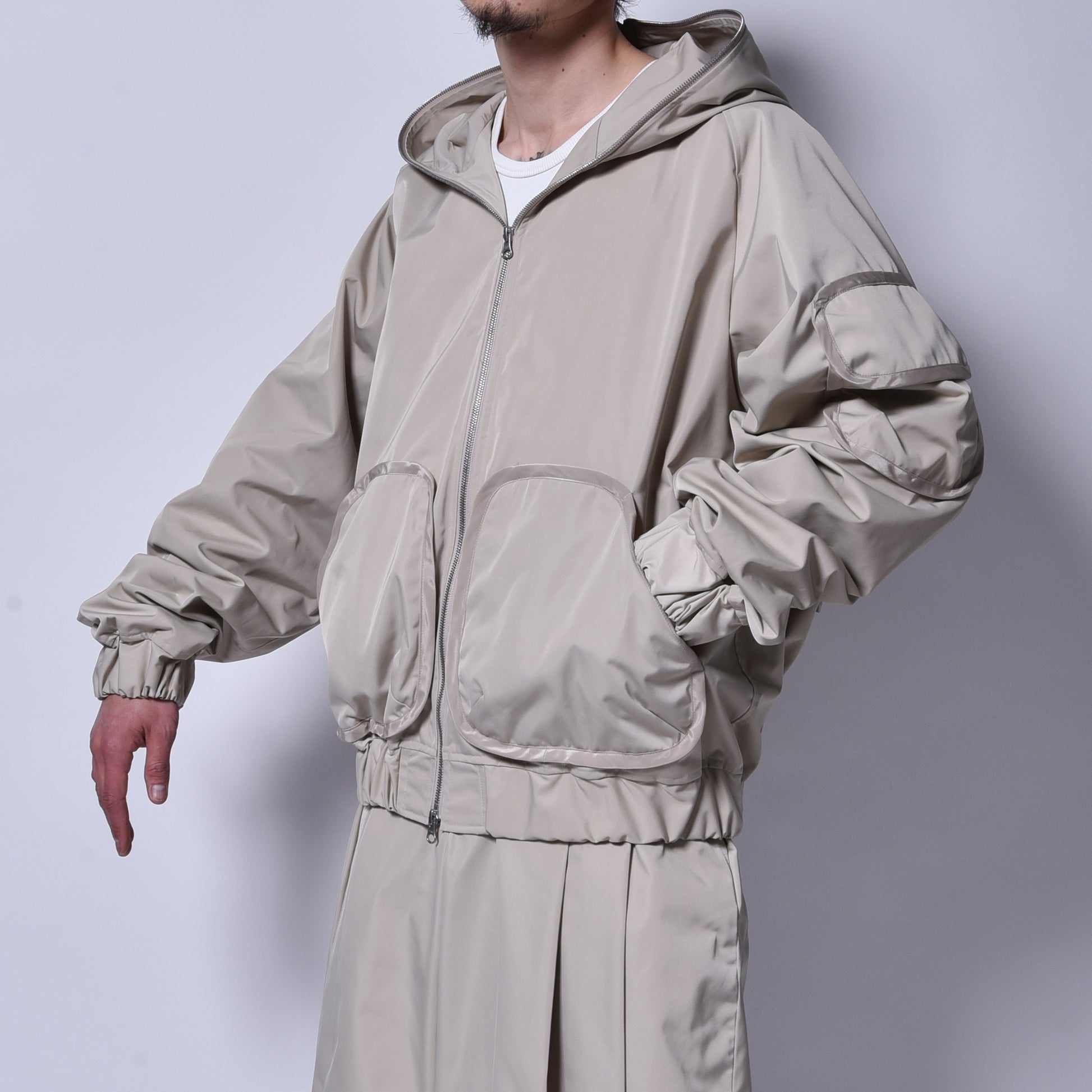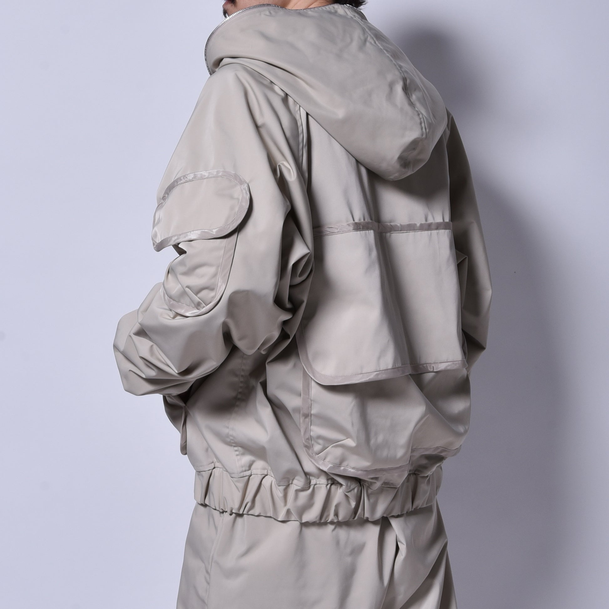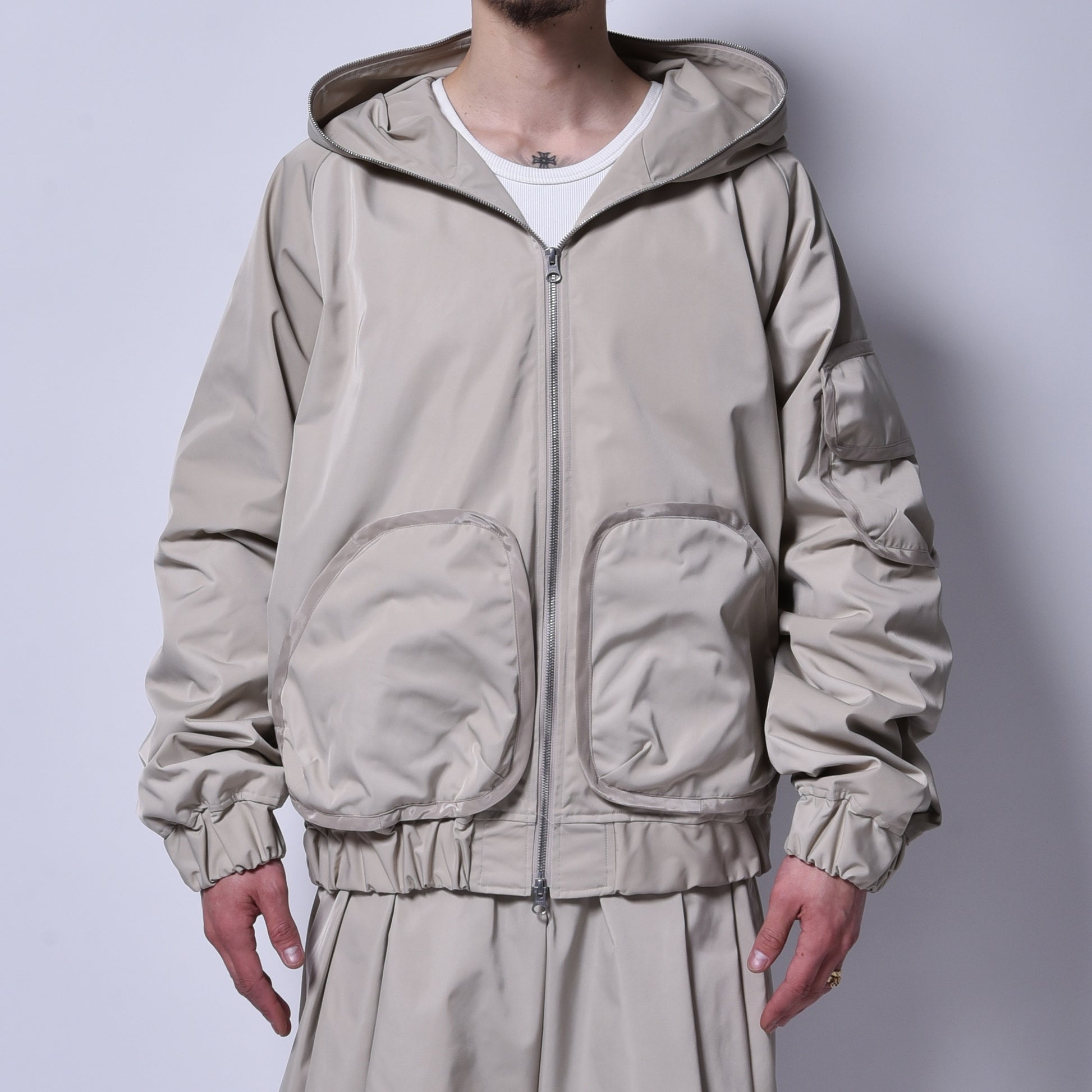 シルエットは顔まで覆い尽くすフルジップのパーカーとMA-1のイメージを融合させたジャケット。全体的に緩さもありつつ接妙なフォルムを作り上げたシルエット。ラグランの袖や袖のポケット、背中にあるビッグポケット、立体感を作りボリューム感あるように考えられた1着。