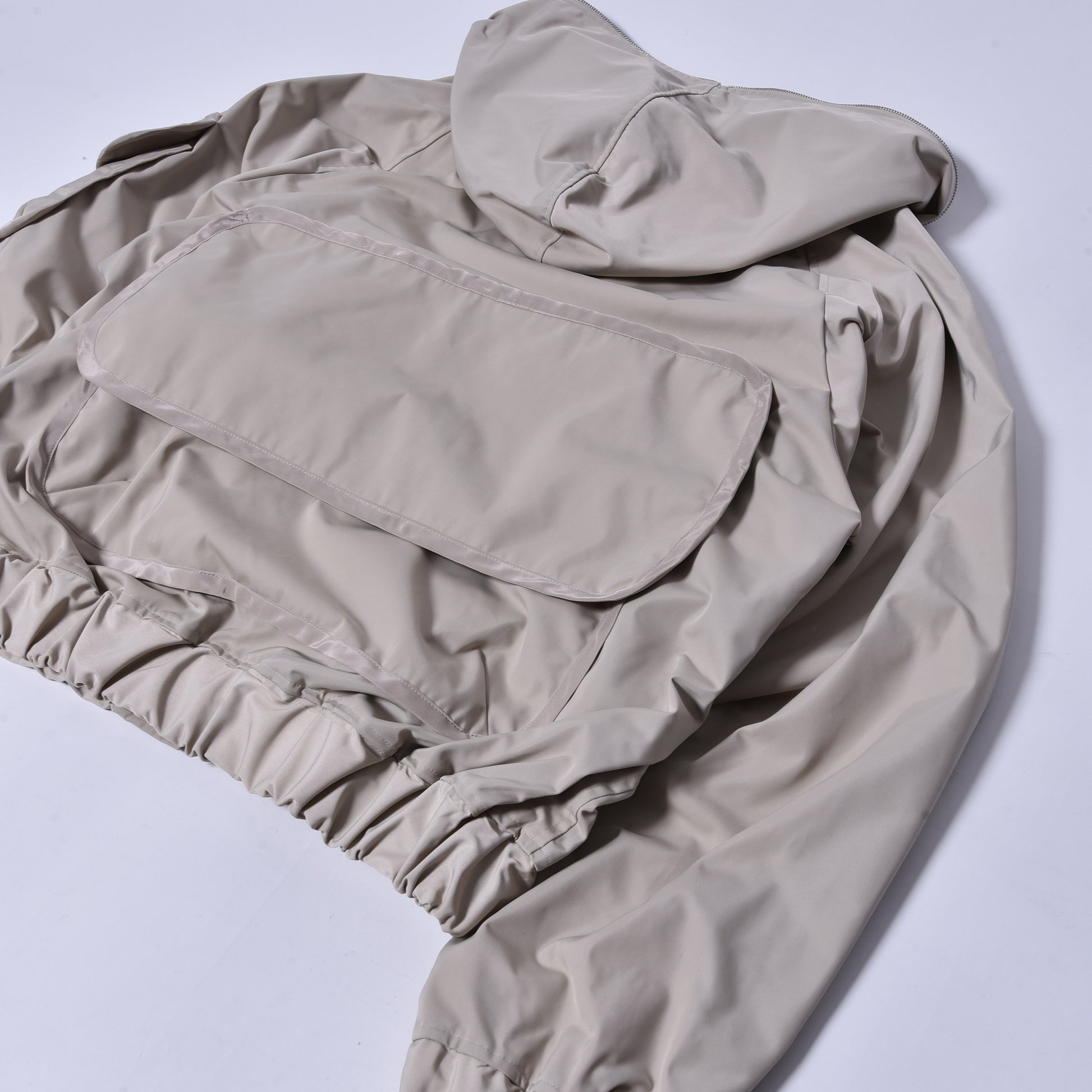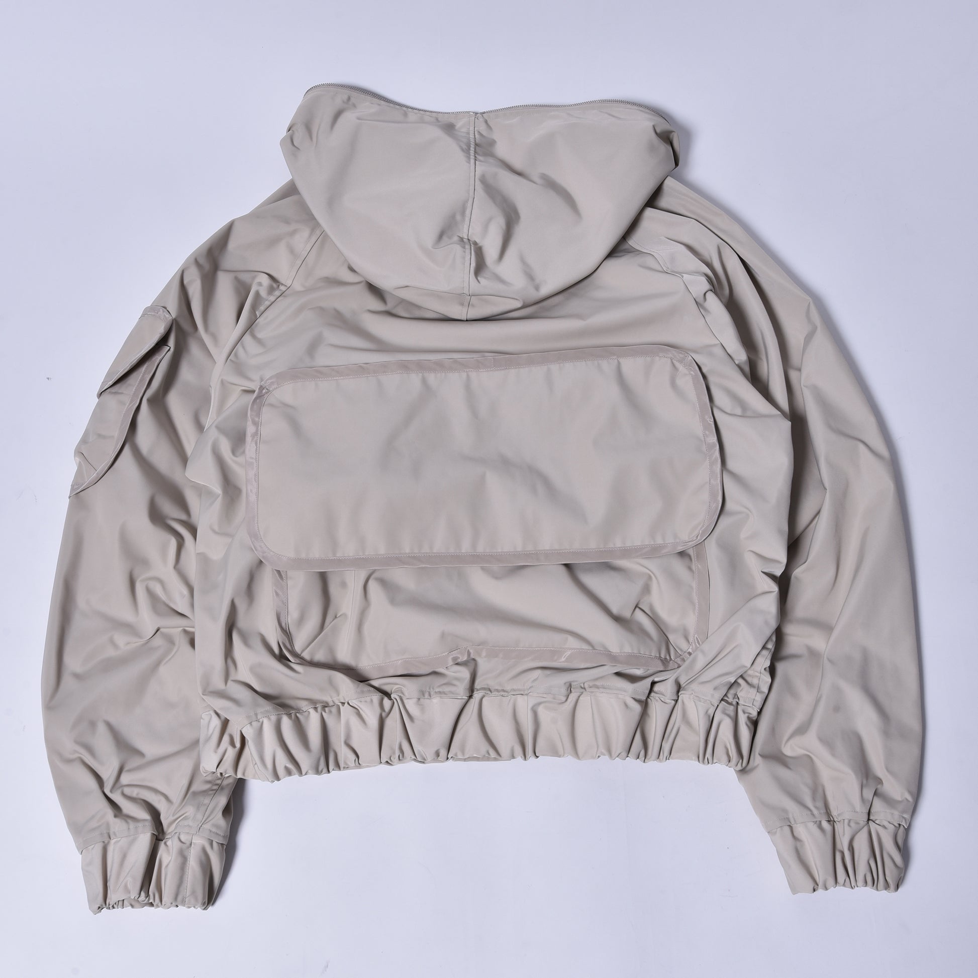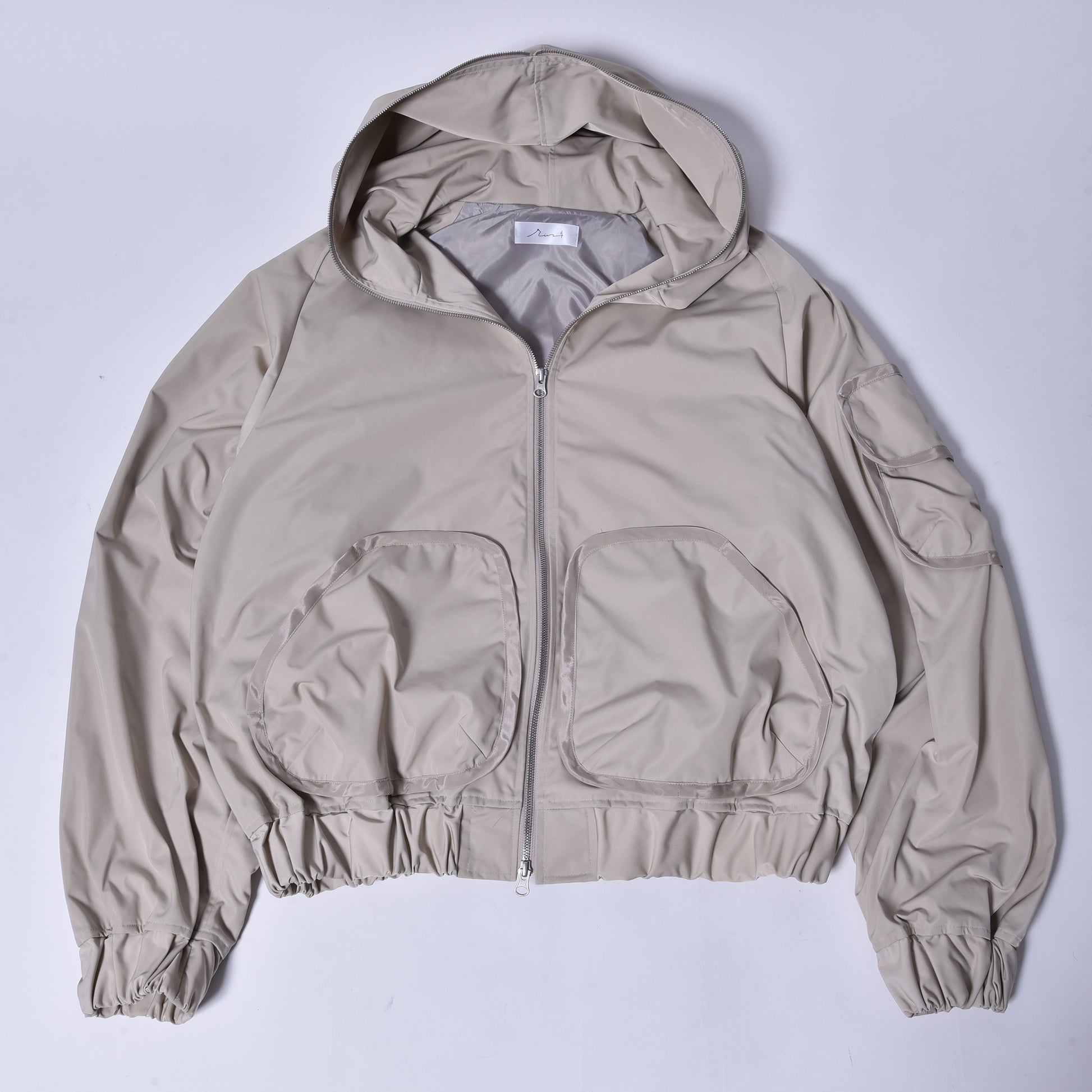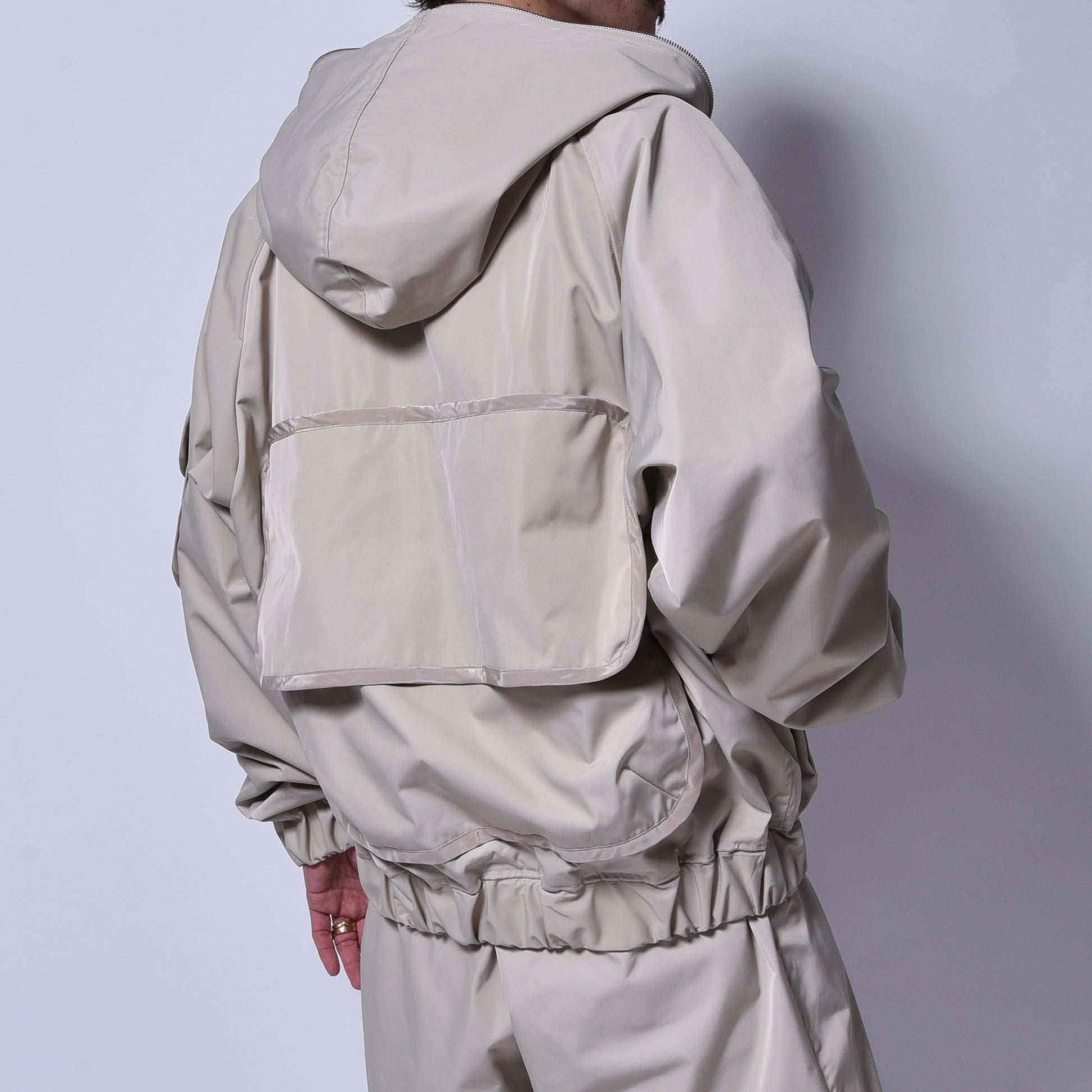 シルエットは顔まで覆い尽くすフルジップのパーカーとMA-1のイメージを融合させたジャケット。全体的に緩さもありつつ接妙なフォルムを作り上げたシルエット。ラグランの袖や袖のポケット、背中にあるビッグポケット、立体感を作りボリューム感あるように考えられた1着。