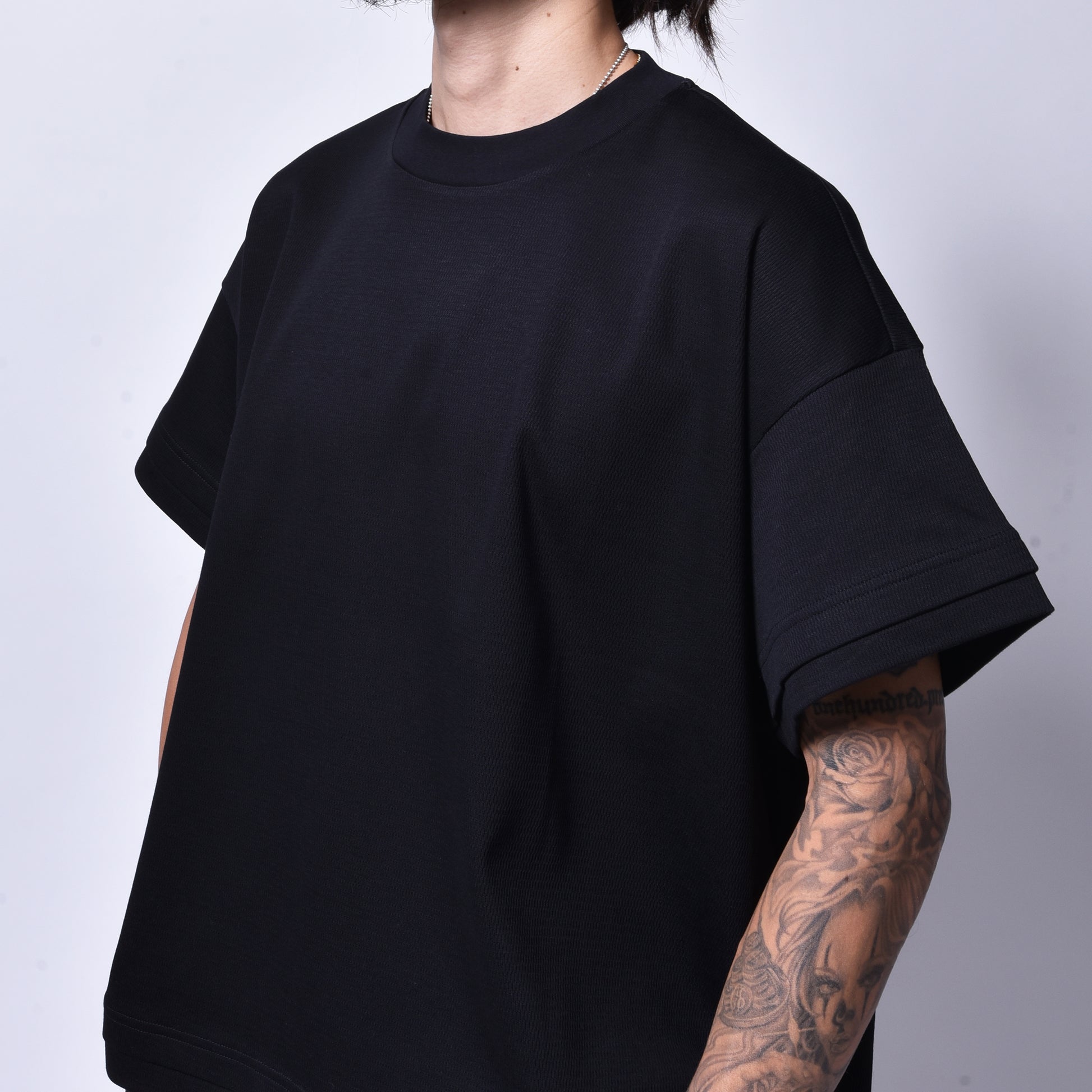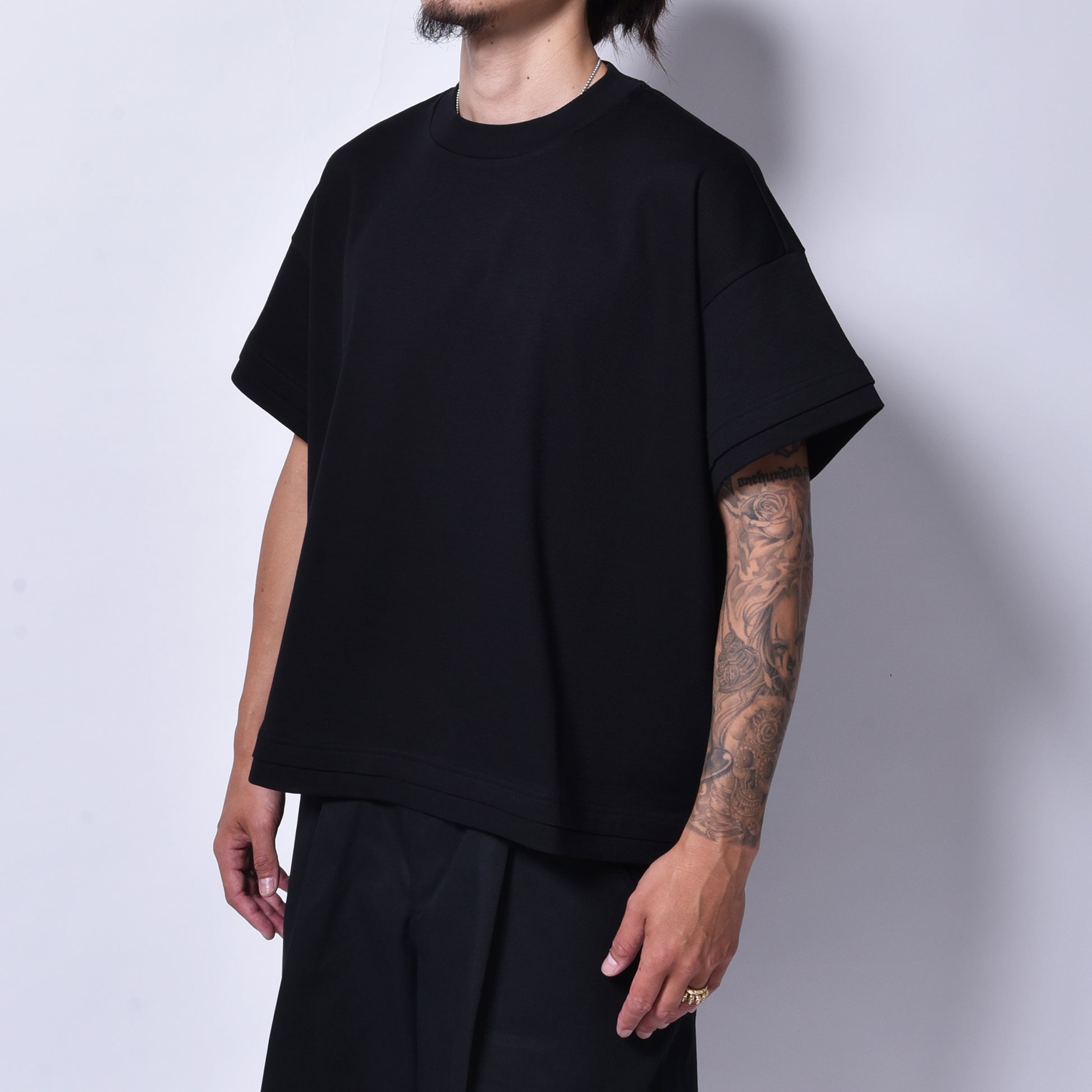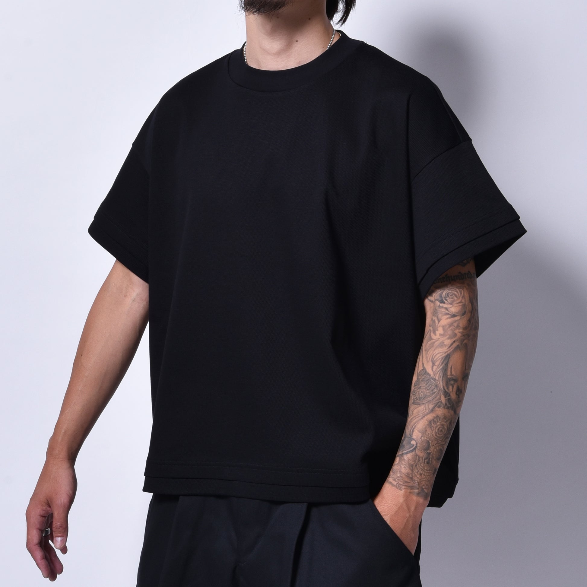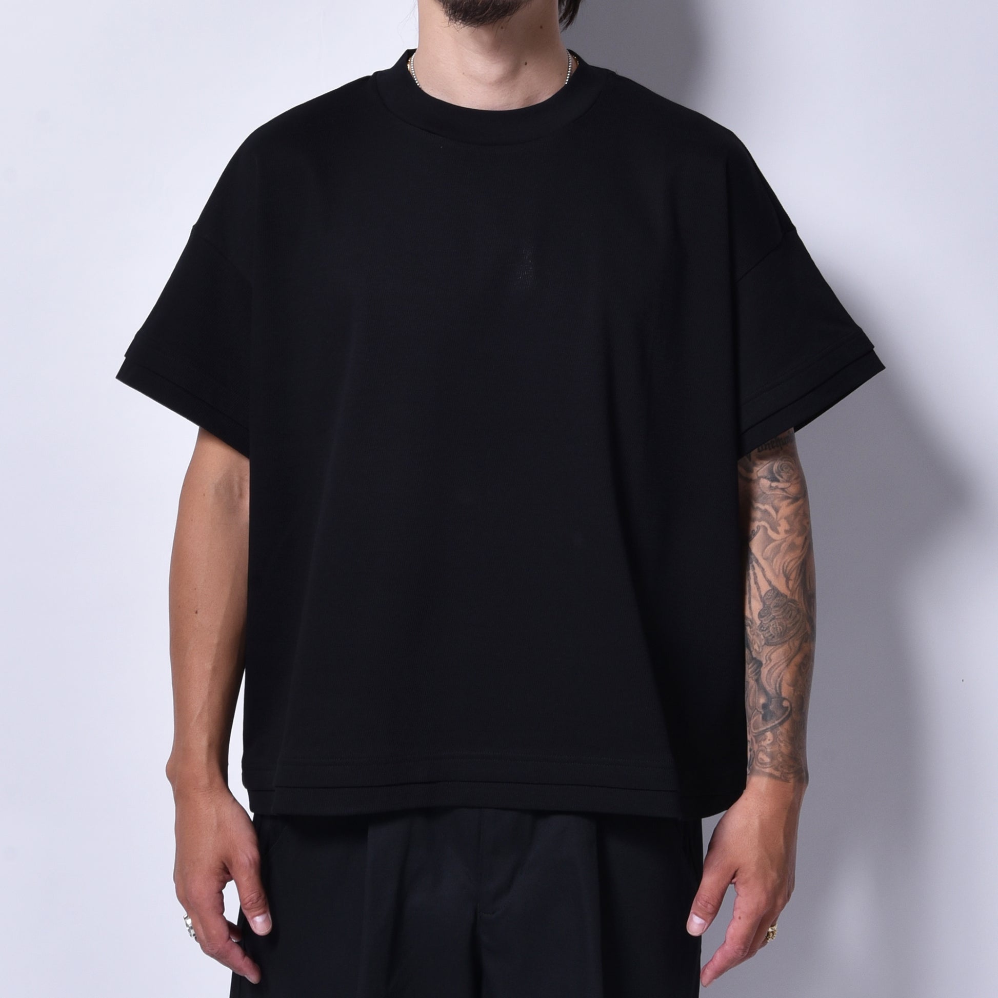 シルエットは、首周りが少しモックネック調に作られた身幅広めの短丈のシルエットになります。