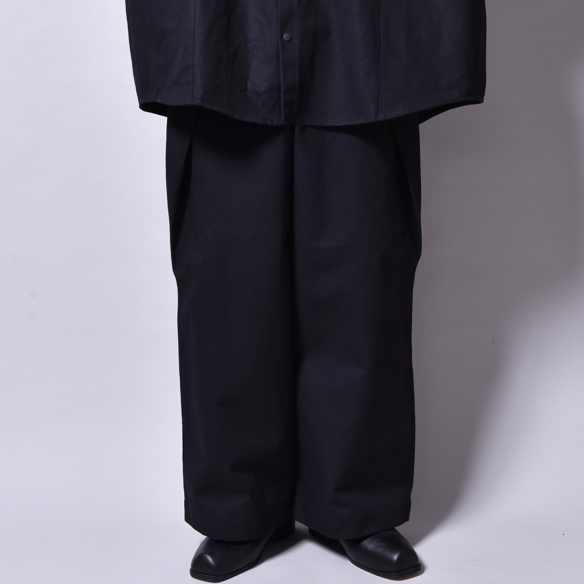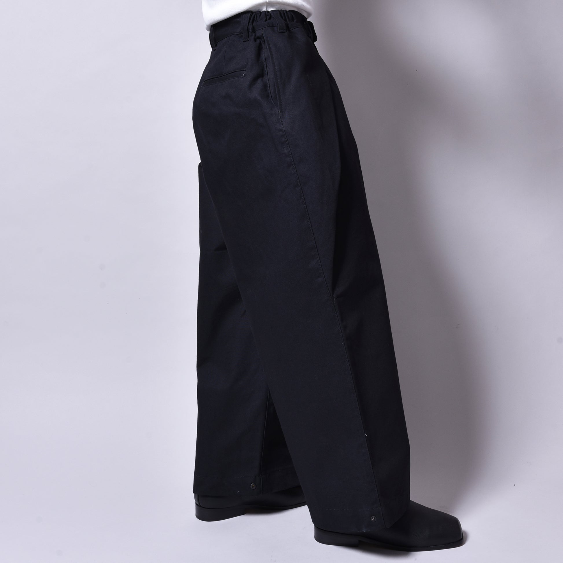 シルエットは程よい長さのオーバーシルエットのワイドパンツ。両サイドに深めのタック、裾にスナップボタンで絞れる調整可能な仕様です。ウエストもサイドゴムシャーなのでストレスなく履けます。履きだすとクセになるタフなパンツです。気分で裾絞っても履けるので幅広いシーンで活躍できるパンツになります。