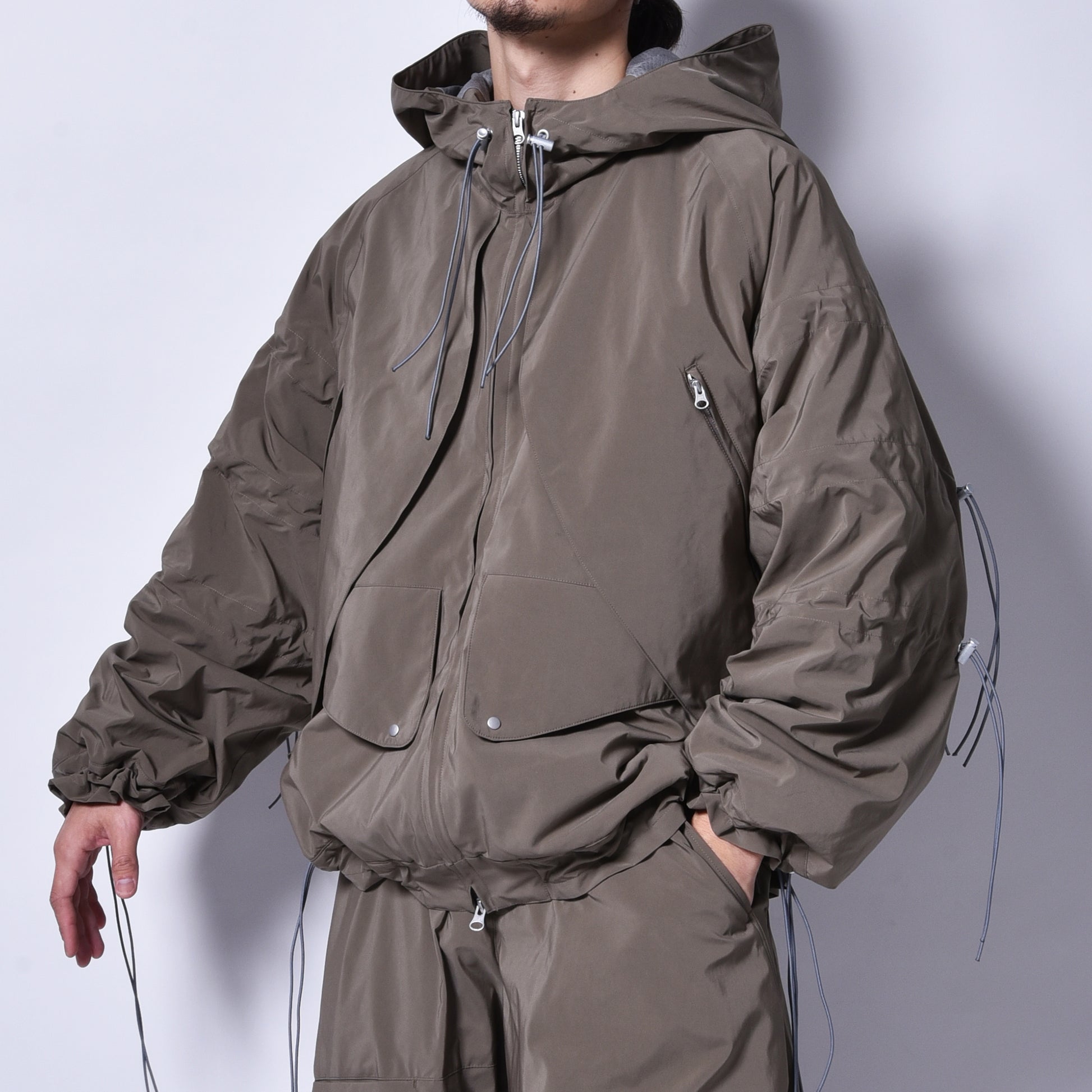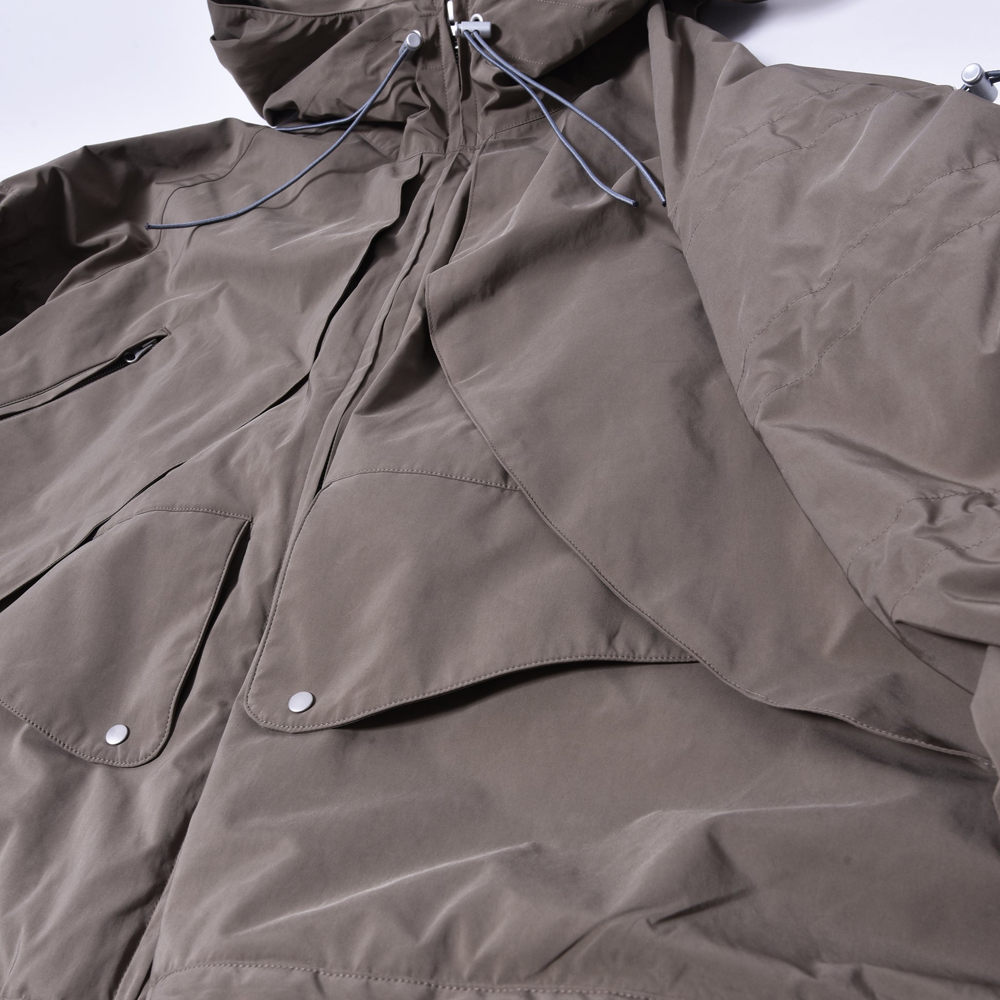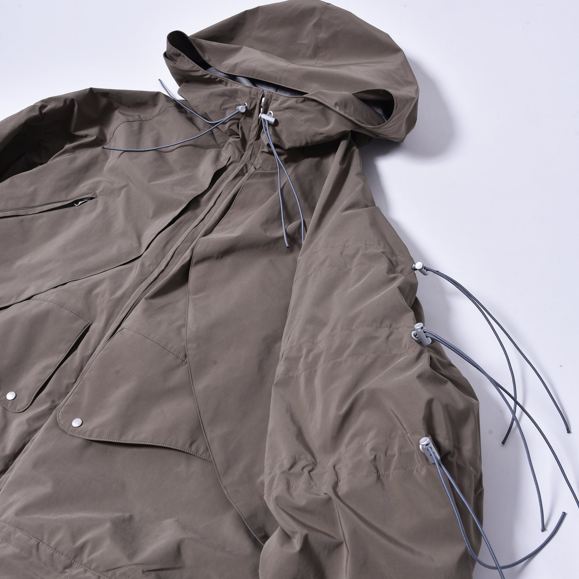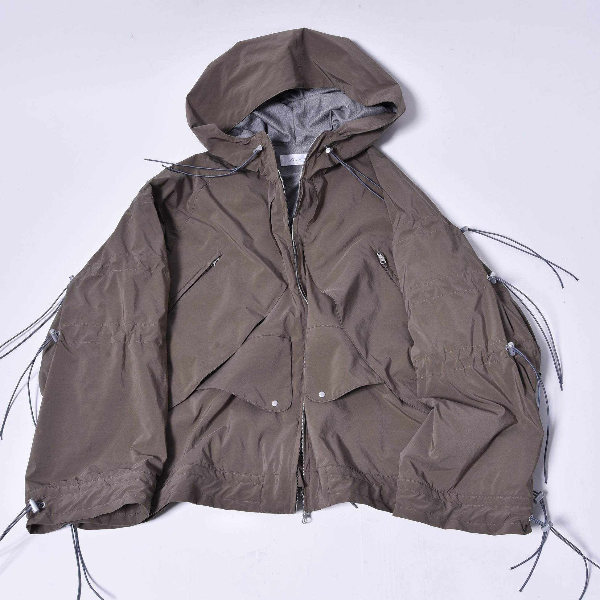 シルエットは全体のドローコードで身幅や着丈はもちろん袖幅なども調整できる仕様になっています。細かく計算されたシルエットになります。細部まで拘り、収納性も高く長撥水性の生地を生かし機能性まで考えられた作品になります。