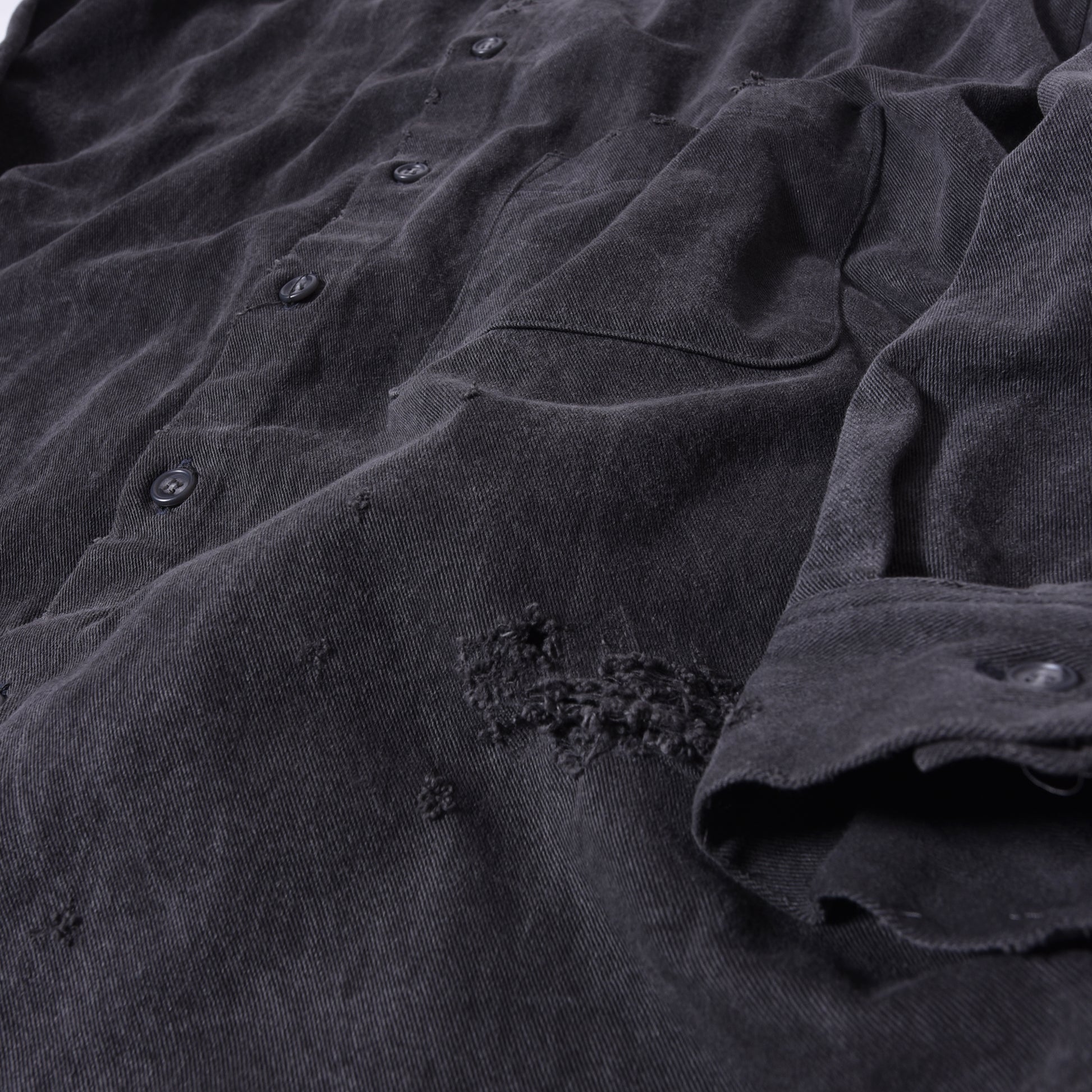素材は生地から炭を染料として使用したカツラギの生地で、程よい肉感とハリ感もありながら着用を重ねると柔らかくなるのが特徴的です。炭染め特有のヴィンテージのような表情と経年変化による色落ちを楽しめる素材です。黒の色味には炭染料と顔料で作り上げている為、風合いが特に変わります。