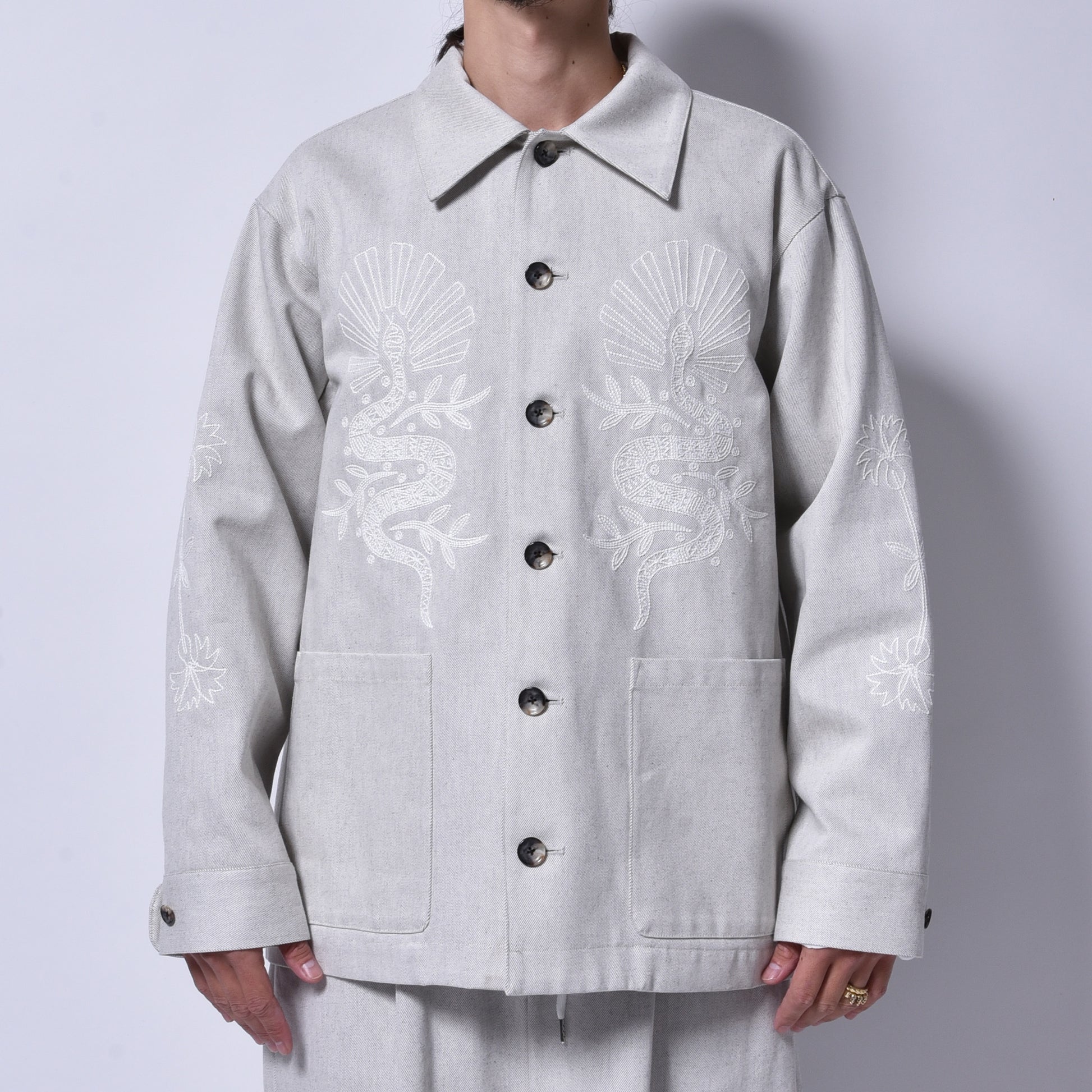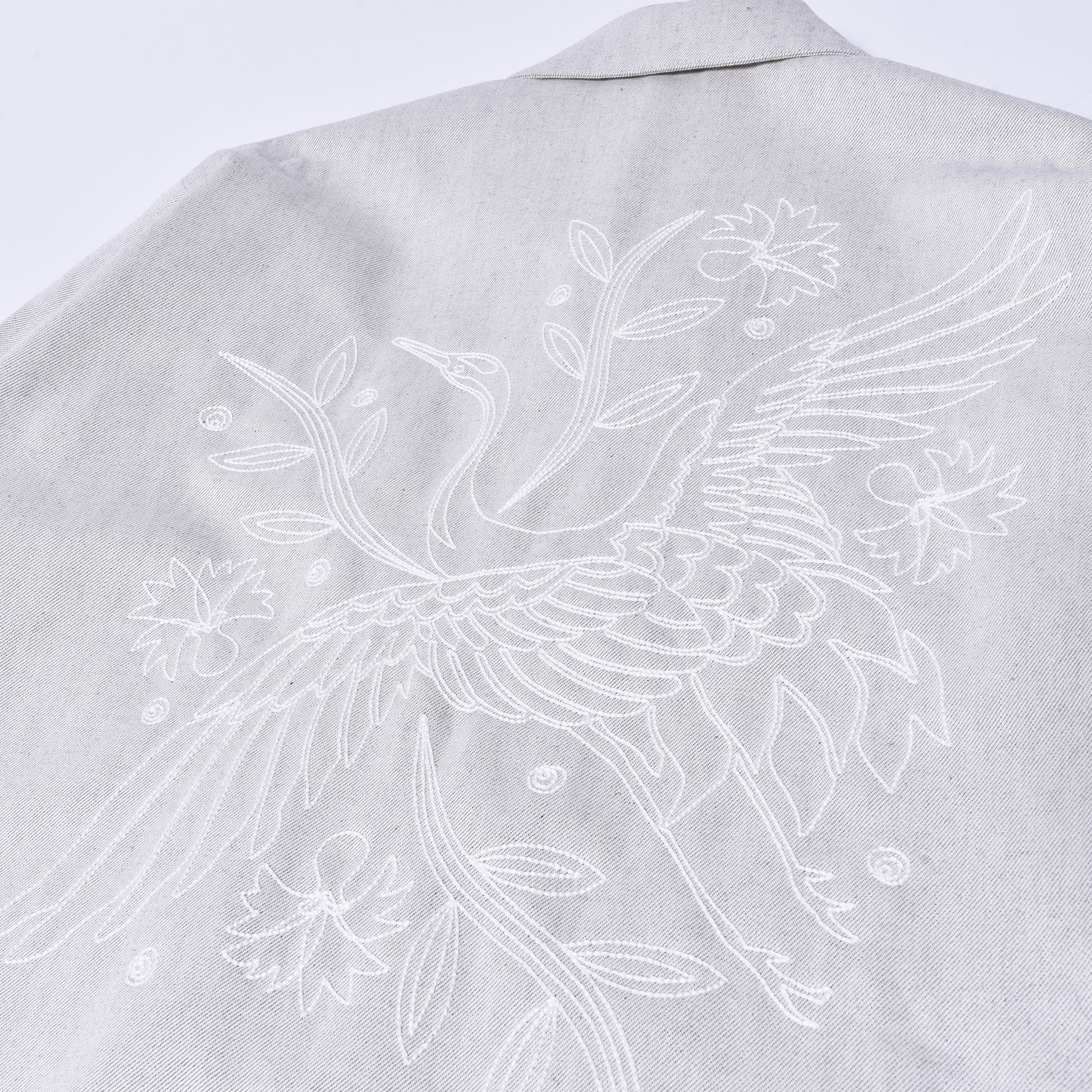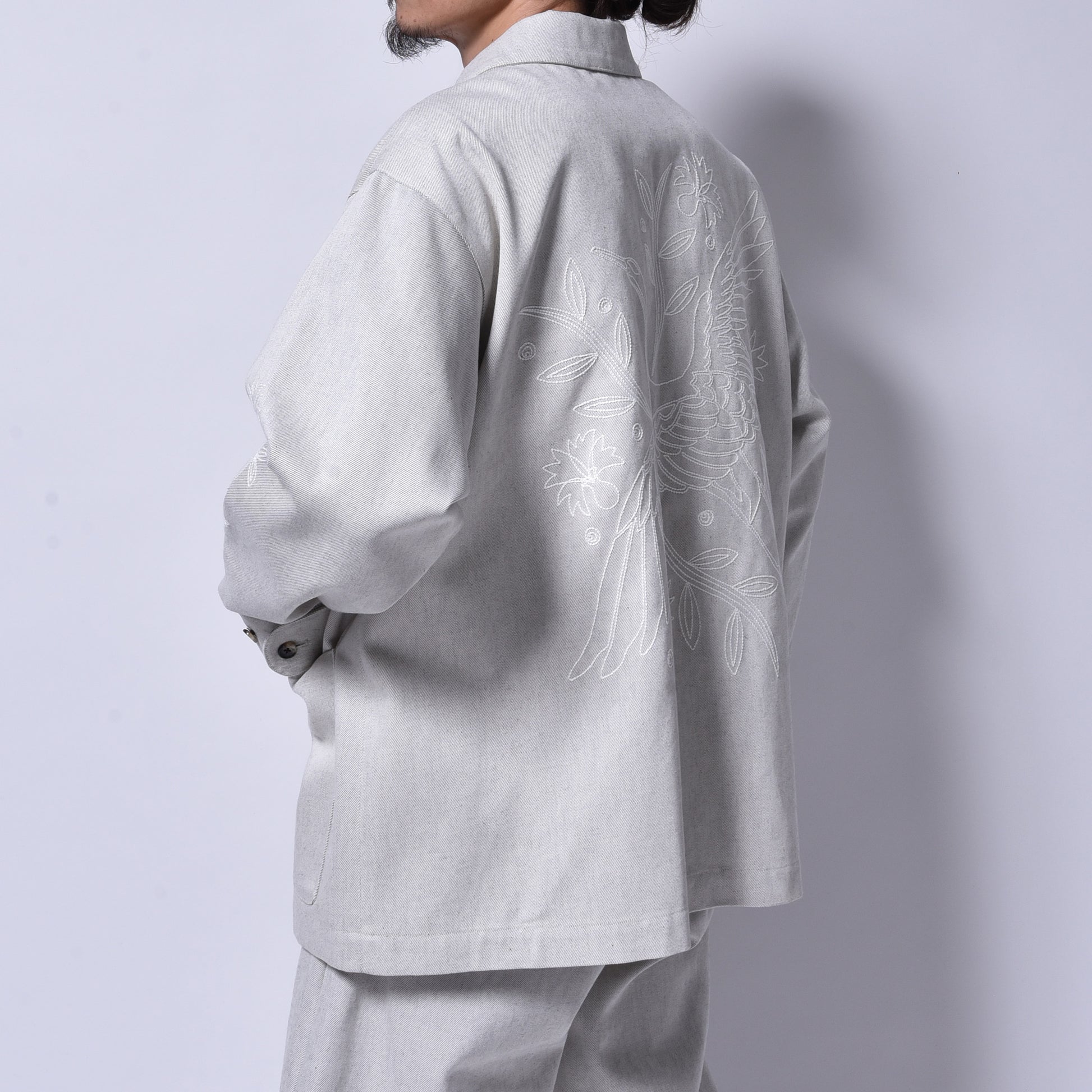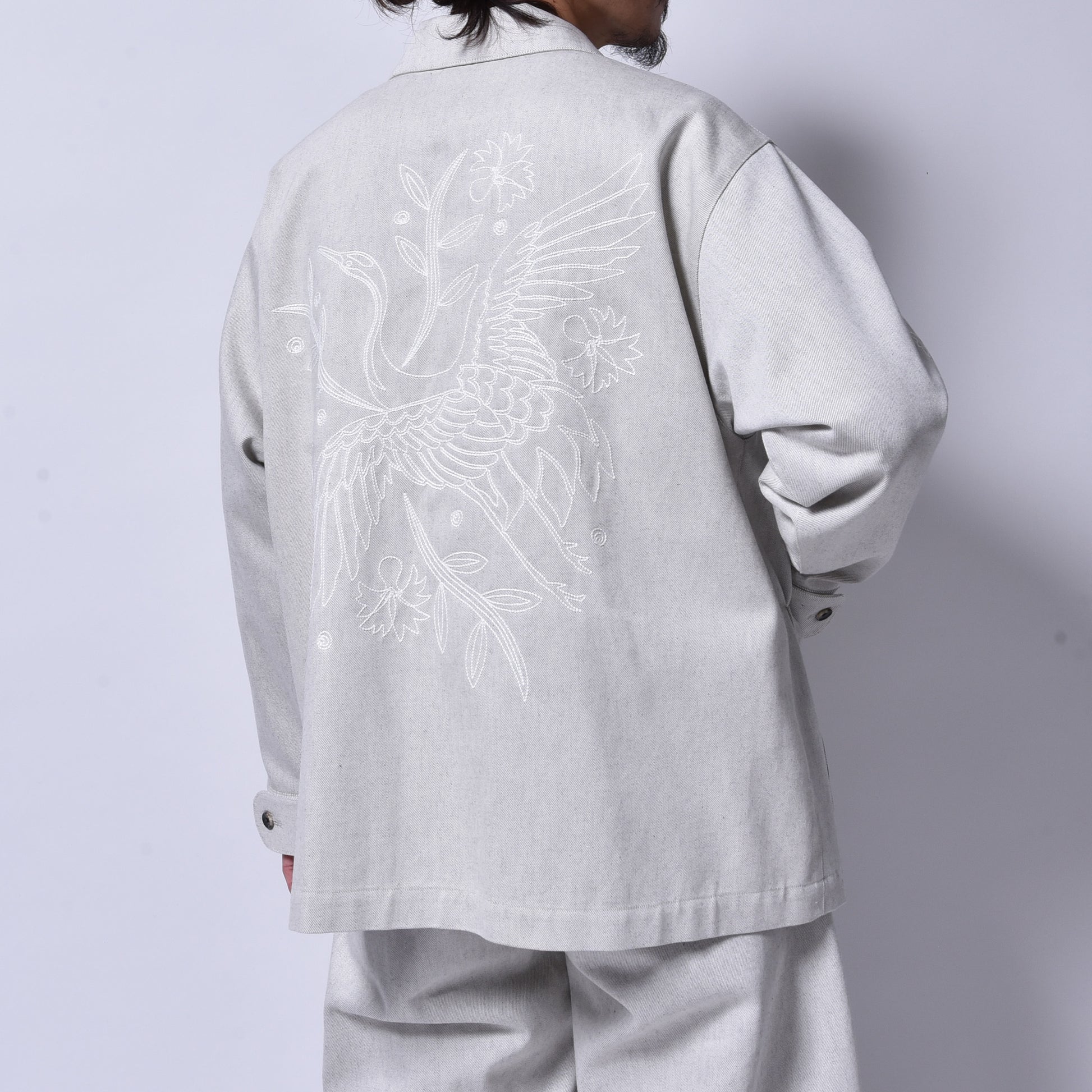 素材は、岡山産オリジナル12ozデニム生地になります。縦横共に黒糸と白糸で織上げたデニムはホワイトグレーのような色味で少し光沢感もありつつ、しっかりとしたオンス。裏地もサラッとした肌触りの生地になります。袖、胸、背中にネイティブと和をモチーフにしたオリジナルデザインを刺繍で落とし込んでおります。綿糸の刺繍にする事で、経年変化と共に風合いが増す使用になります。