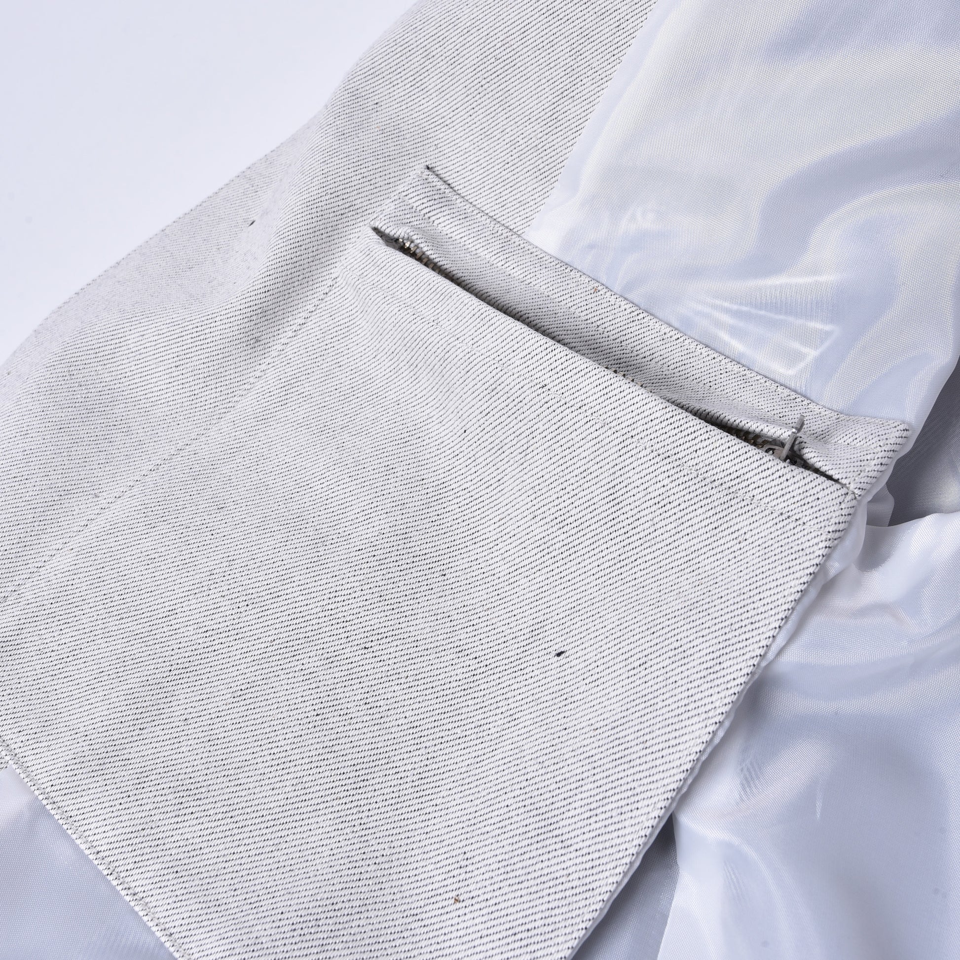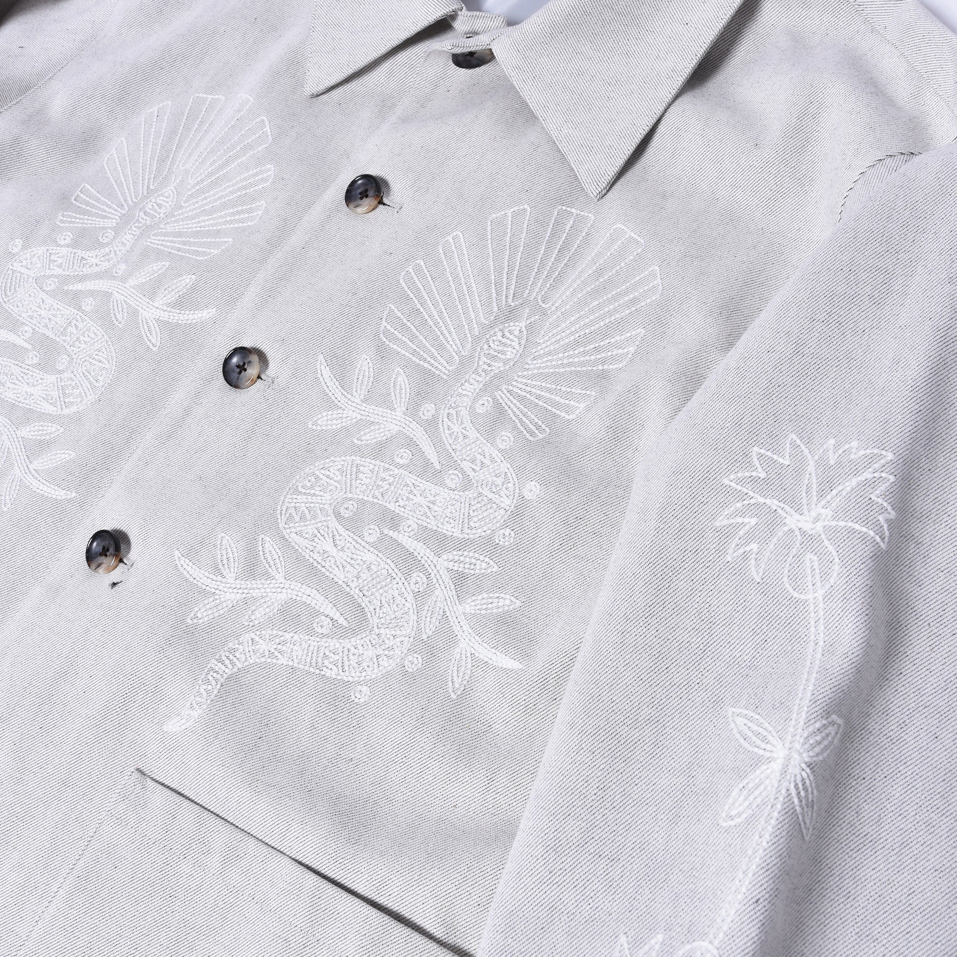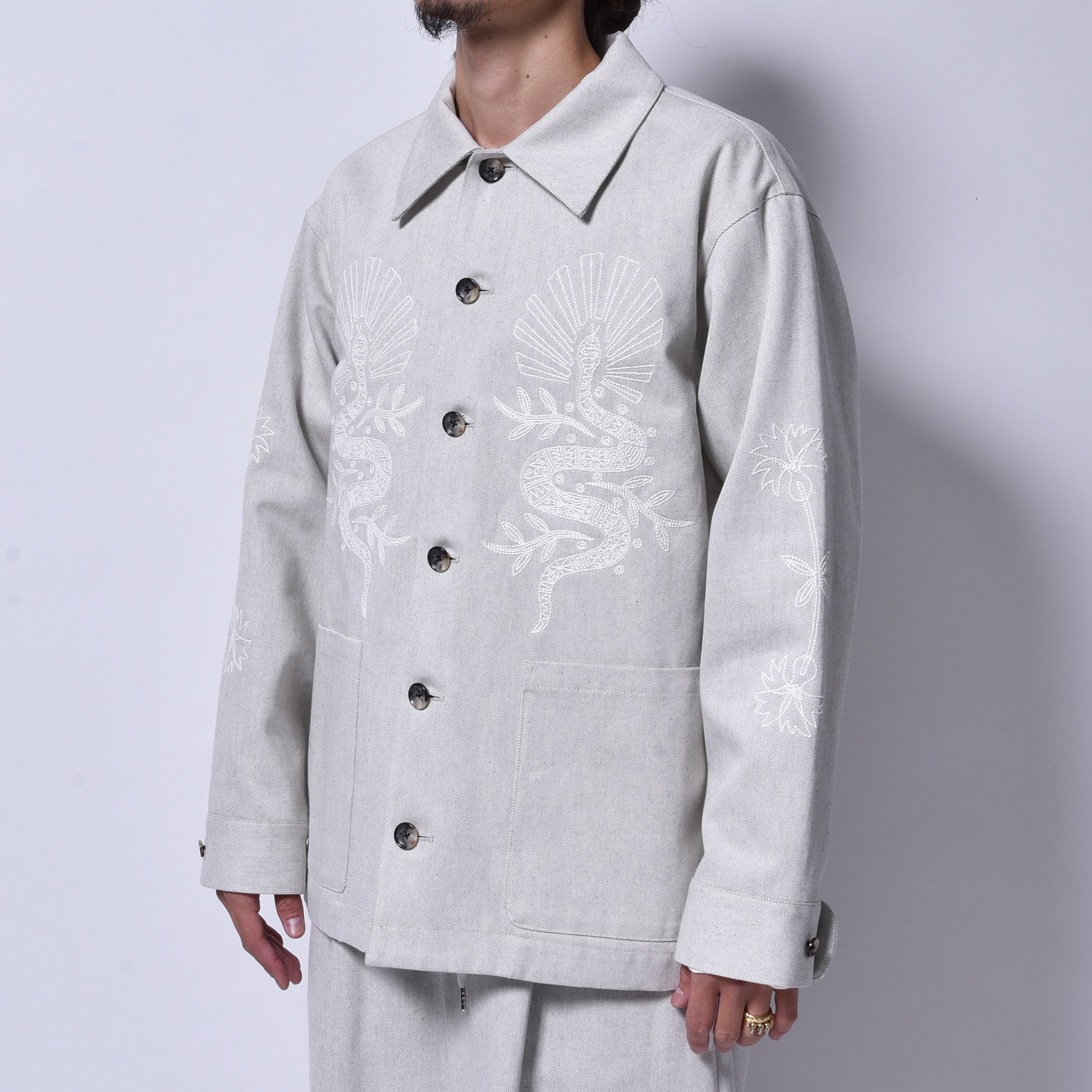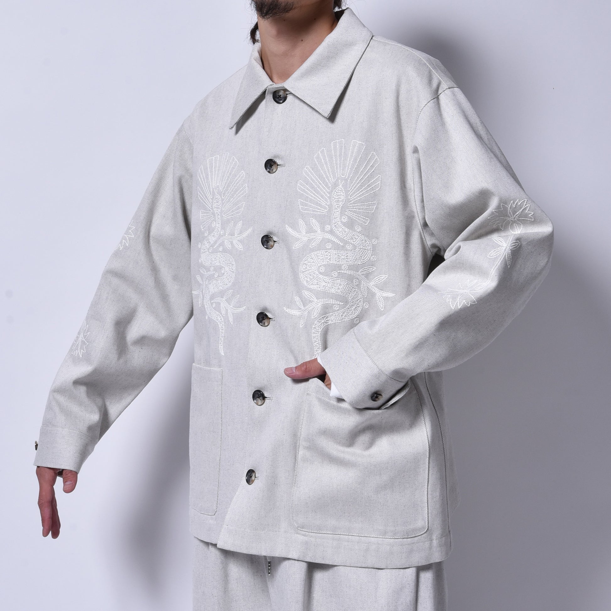 素材は、岡山産オリジナル12ozデニム生地になります。縦横共に黒糸と白糸で織上げたデニムはホワイトグレーのような色味で少し光沢感もありつつ、しっかりとしたオンス。裏地もサラッとした肌触りの生地になります。袖、胸、背中にネイティブと和をモチーフにしたオリジナルデザインを刺繍で落とし込んでおります。綿糸の刺繍にする事で、経年変化と共に風合いが増す使用になります。