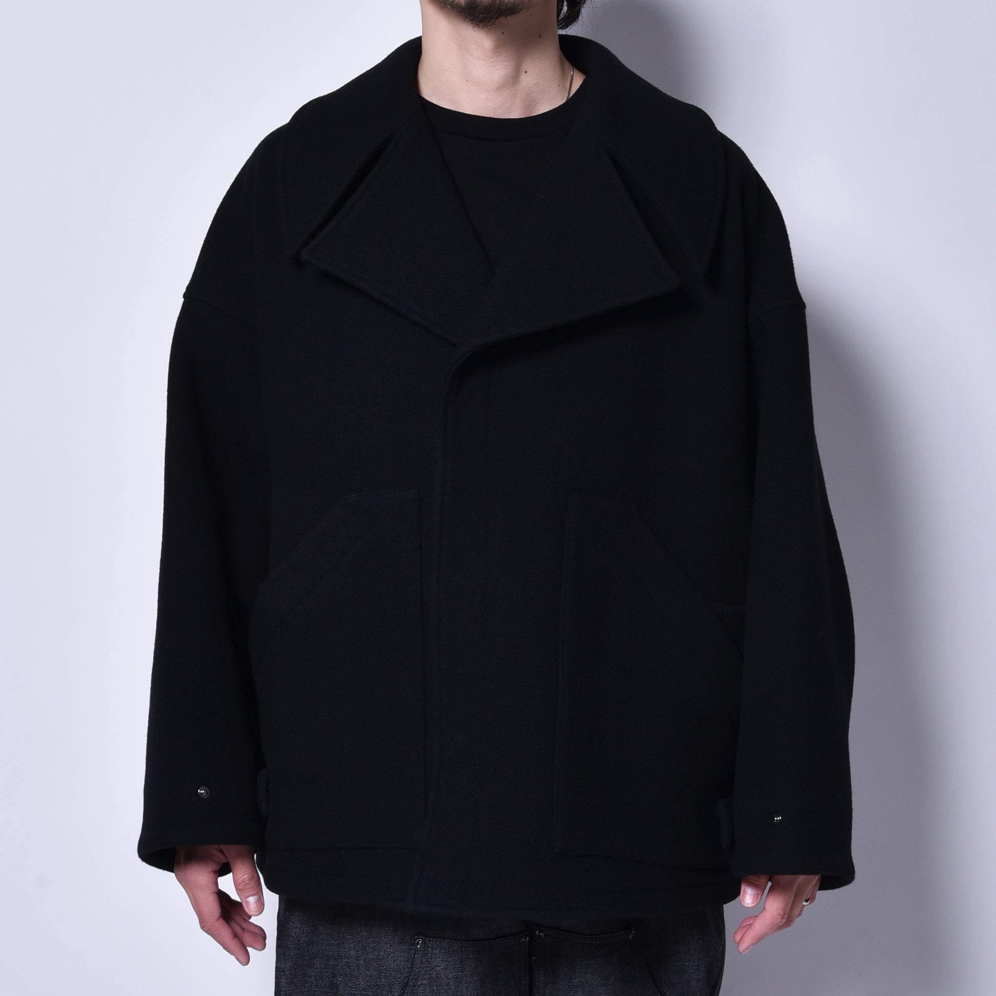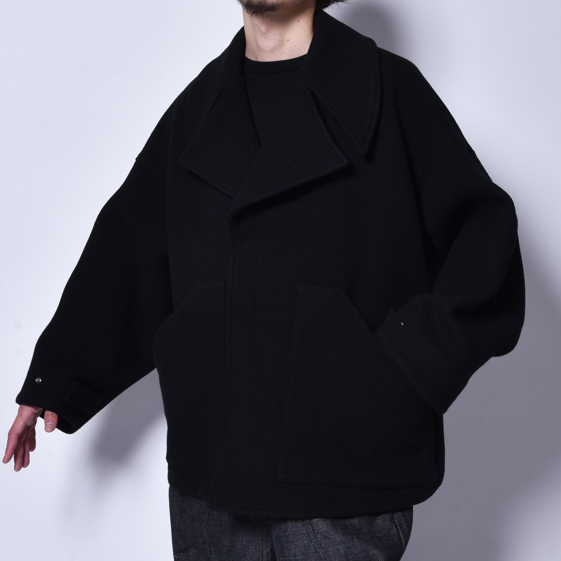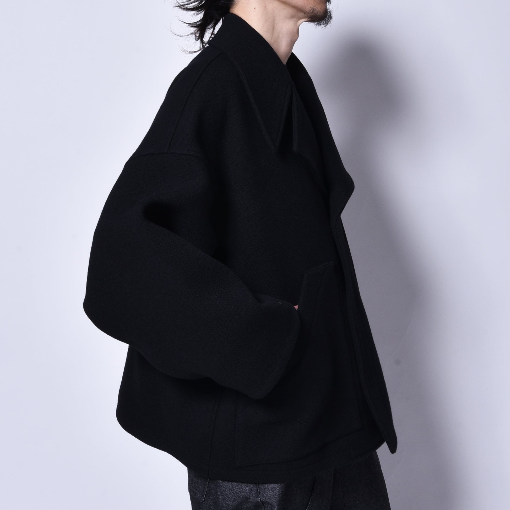 シルエットはショート丈でも身幅から肩周りの広さを計算して大きくしつつも違和感なく着用できるシルエットになります。独特のラインは生地との相性を計算して作られた最高のシルエットを実現。着用時のストレスもなく幅広い方にお勧めできる1着になります。